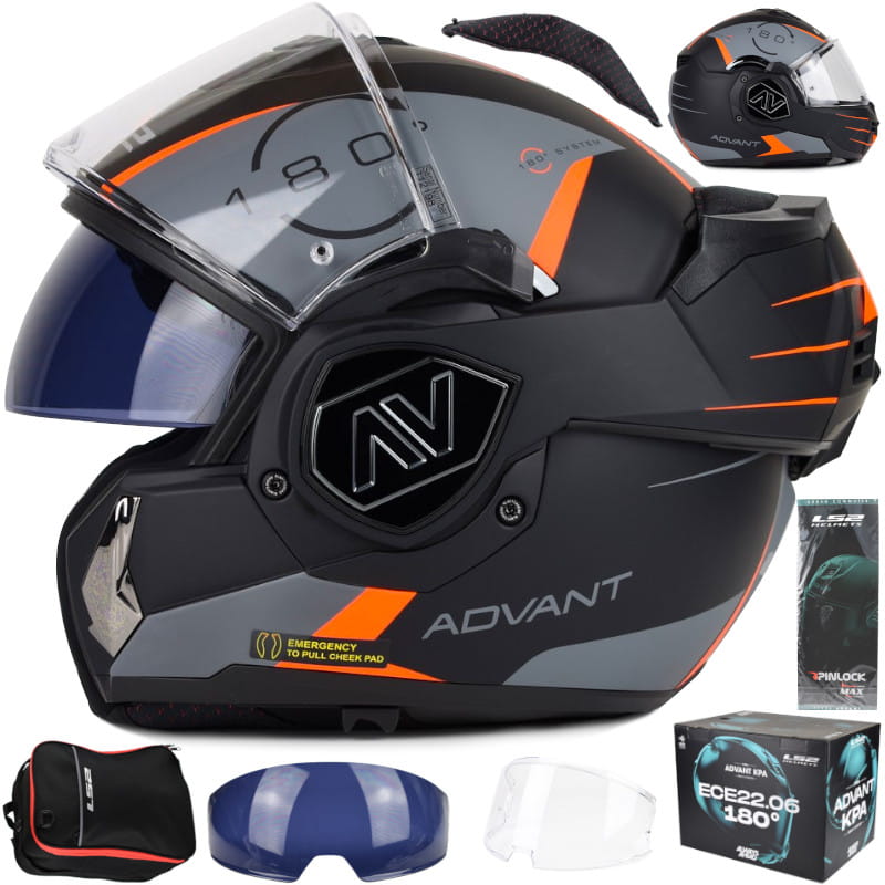 LS2 FF906 Advant to nowoczesny kask modularny, który kontynuuje legendę bestsellerowego modelu LS2 Valiant, oferując jeszcze lepszą funkcjonalność, wygodę i bezpieczeństwo. Dzięki przeprojektowanej konstrukcji i zaawansowanym metodom produkcji model udało się odchudzić, osiągając wagę jedynie 1700 ± 50 g, co czyni go jednym z najlżejszych kasków typu flip-up spełniających normę ECE 22.06. Skorupa wykonana z nowoczesnego materiału KPA® zapewnia wysoką odporność na uderzenia oraz elastyczność, zachowując jednocześnie niską masę. Podwójna homologacja P/J umożliwia legalną jazdę zarówno w pozycji otwartej, jak i zamkniętej. W standardzie kask wyposażono w Pinlock®, zintegrowaną blendę przeciwsłoneczną, wysokiej jakości wizjer oraz system awaryjnego zwalniania poduszek policzkowych. Advant jest także przygotowany do montażu dedykowanego interkomu LS2, co czyni go idealnym wyborem do turystyki, jazdy miejskiej i dalekich podróży.