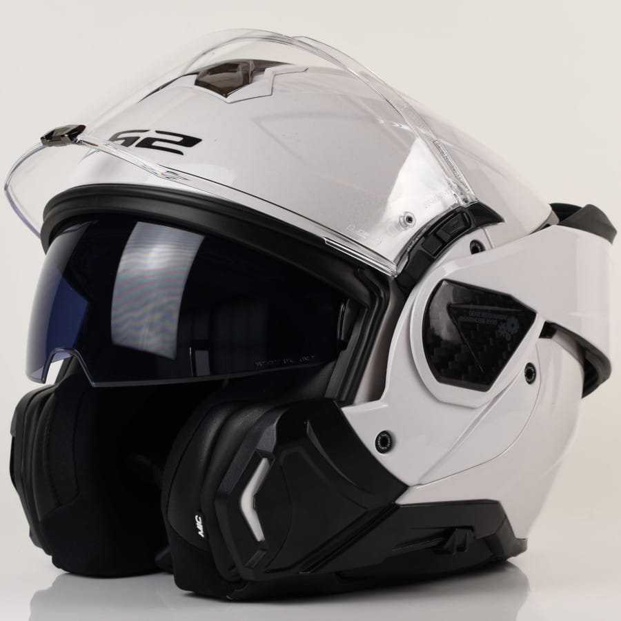LS2 FF906 Advant II to najnowsza generacja kasków modularnych LS2, będąca kontynuacją legendarnych modeli z serii Valiant. Dzięki zastosowaniu nowoczesnych technologii produkcji oraz zoptymalizowanej konstrukcji, kask spełnia najwyższe normy bezpieczeństwa ECE 22.06, jednocześnie pozostając jednym z najlżejszych kasków typu flip-up na rynku. Wykonana z KPA® skorupa oraz dodatków z Carbonu łączy wysoką odporność na przebicia, elastyczność i niską wagę, a możliwość legalnej jazdy zarówno w pozycji zamkniętej, jak i otwartej dzięki homologacji P/J zwiększa funkcjonalność modelu. Advant II wyposażono w odporny na zarysowania wizjer z ochroną UV, zintegrowaną blendę przeciwsłoneczną oraz Pinlock® 120XLT w zestawie. Kask jest przygotowany do montażu Interkomu LS2.